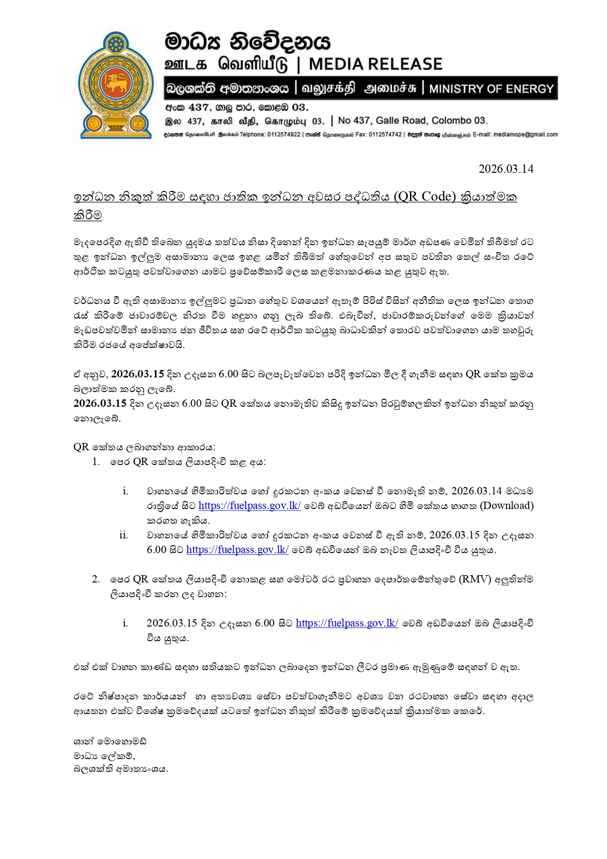 ඉන්ධන නිකුත් කිරීම සදහා ජාතික ඉන්ධන අවසර පත (QR Code) ක්රියාත්මක කිරීම